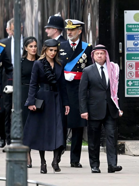 ارتدت الملكة رانيا قبعة سوداء بسيطة، كعلامة احترام للملكة.