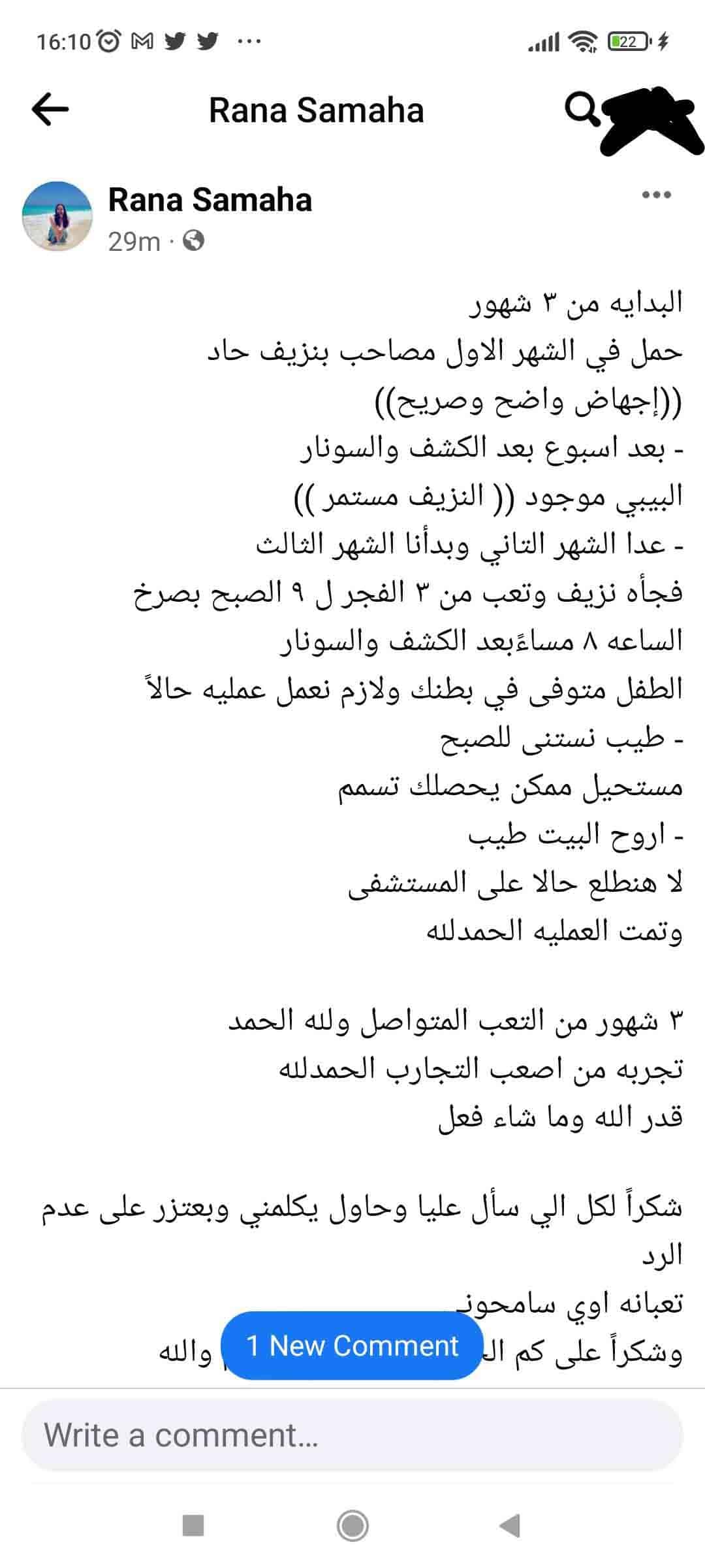 وتابعت: “بعد أسبوع بعد الكشف والسونار البيبي موجود والنزيف مستمر. عدا الشهر التاني وبدأنا الشهر الثالث فجأة نزيف وتعب من 3 الفجر لـ 9 الصبح بصرخ. الساعه 8 مساء بعد الكشف والسونار الطفل متوفى في بطنك ولازم نعمل عملية حالا”.