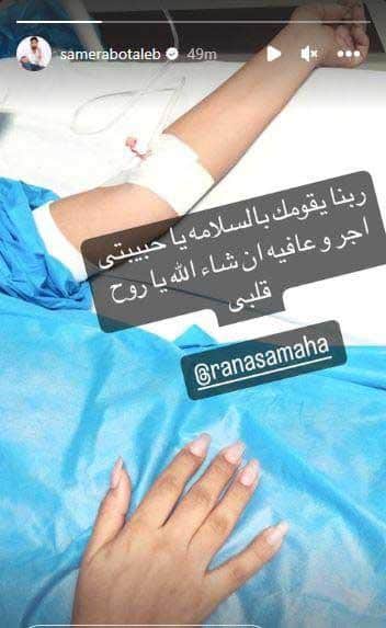 هذا وقد نشر زوج رنا سماحة، الملحن سامر أبو طالب، صورة لزوجته وهي بالمستشفى. وعلق: “ربنا يقومك بالسلامة يا حبيبتي، أجر وعافية إن شاء الله يا روح قلبي”.