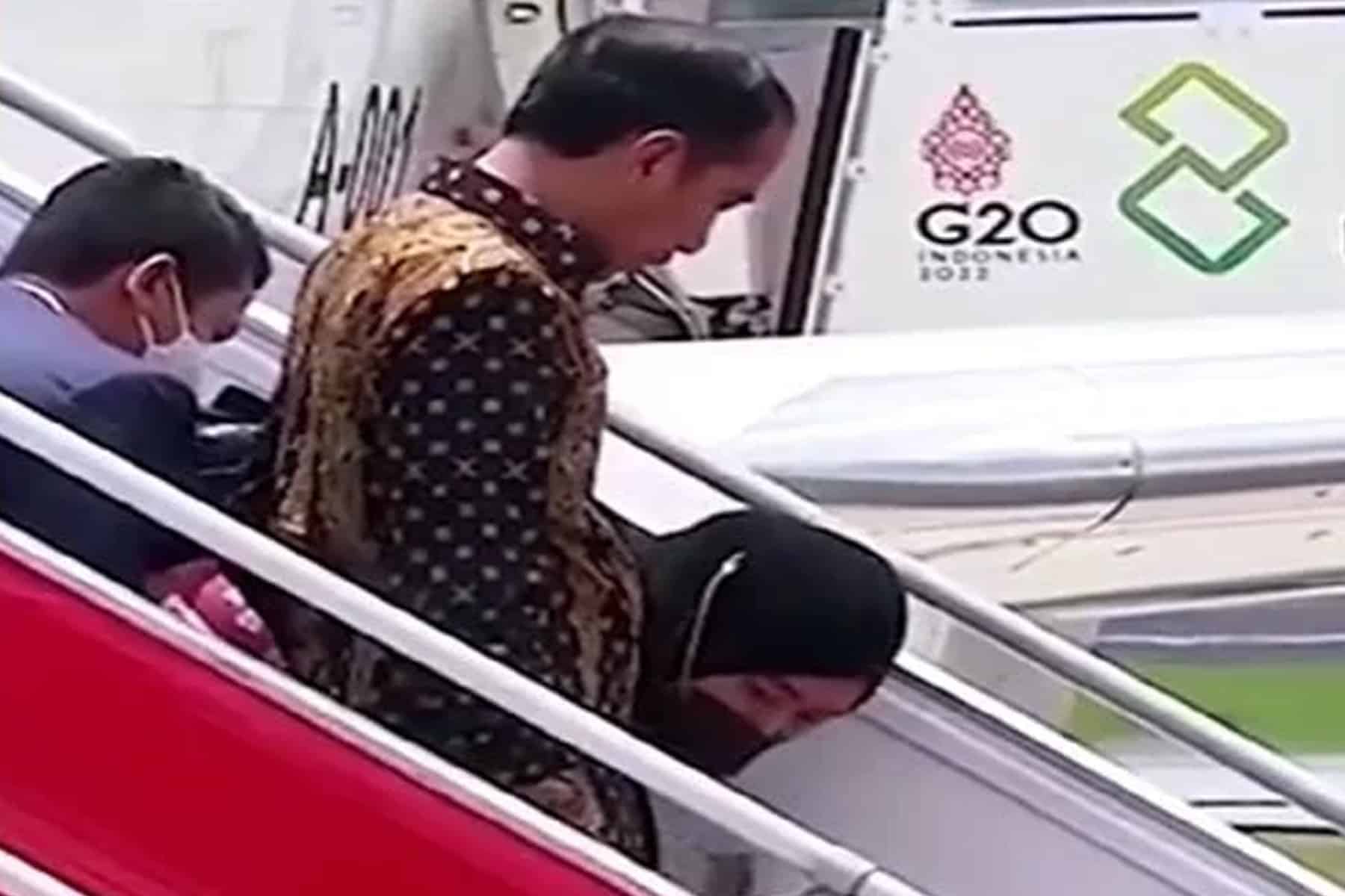 وطن- تعرّضت سيدة أندونيسيا الأولى “إيريانا جوكو ويدودو” لموقف محرج، أثناء نزولها على سلم الطائرة برفقة زوجها في مطار آي غوستي نغوراه راي الدولي، لحضور قمة مجموعة العشرين في جزيرة بالي.