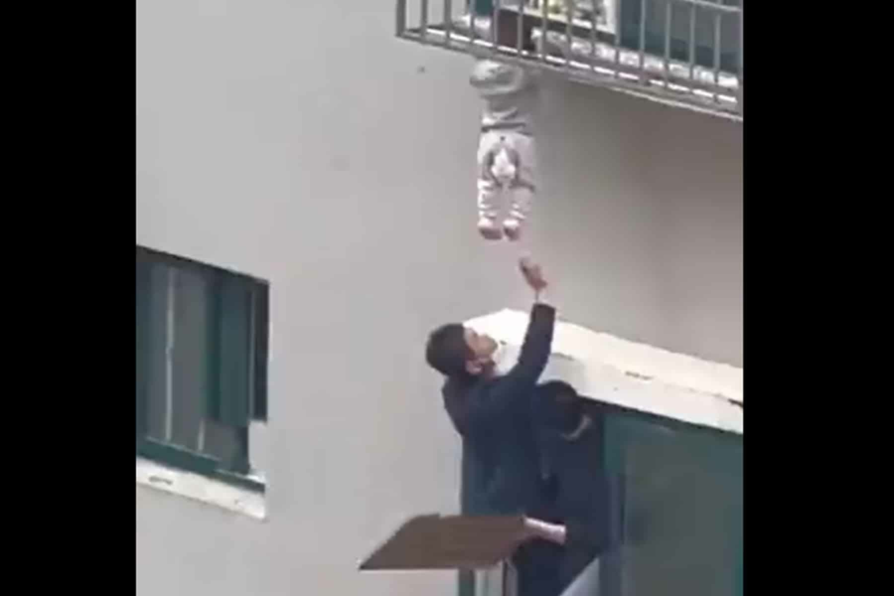 وأظهر فيديو متداول طفلاً لم يتجاوز السنة من عمره معلقاً من رقبته داخل شبك حديدي لنافذة منزل، وبدا في نافذة الشقة أسفلها شابان يحاولان الوصول إليه فيقوم أحدهما برفع كرسي صغير ويتمكن اللطفل من الأستناد بقدميه على الكرسي