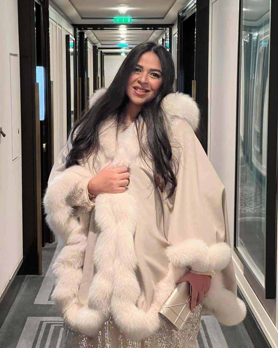 وارتدت إيمي فستاناً طويلاً مع كاب من الفرو، لكنها بدت بوزن زائد.