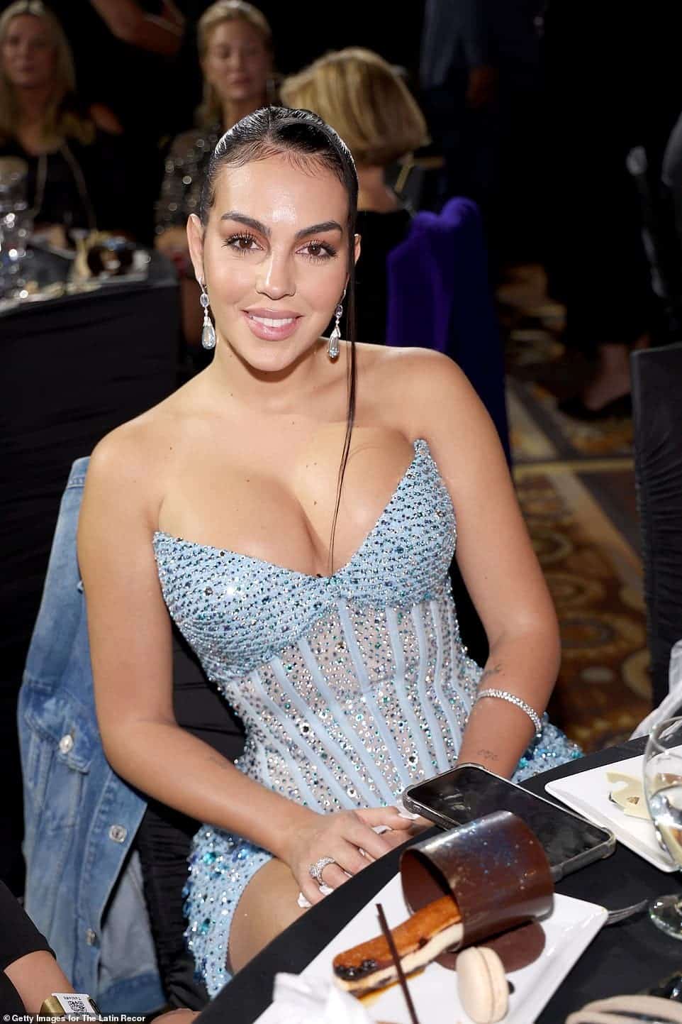 ارتدت صديقة كريستيانو رونالدو البالغة من العمر 28 عامًا، فستانا جريئاً باللون الأزرق الجليدي، يتميز بفتحة في الفخذ، مما يتيح للجميع رؤية الكثير من ساقها.