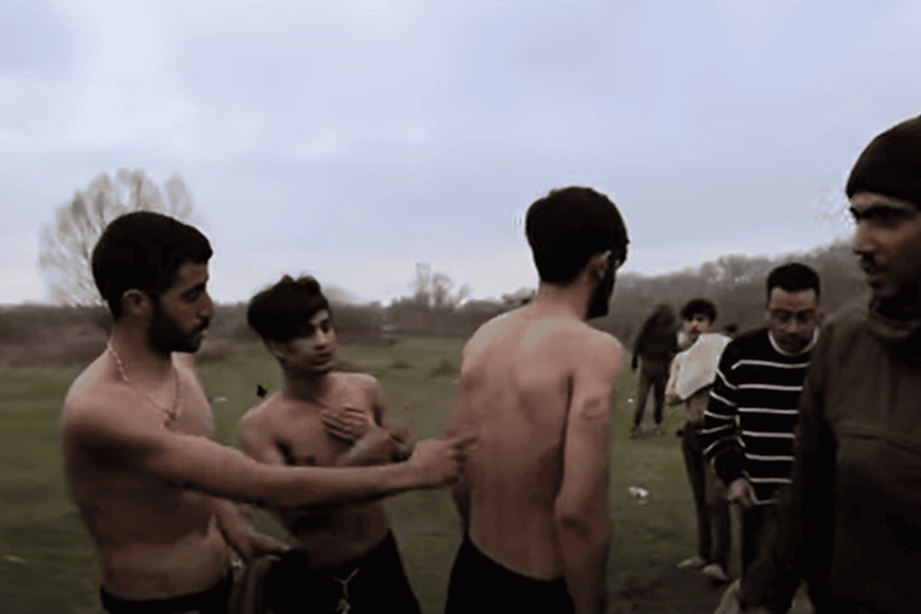 وظهر مجموعة من المهاجرين العراة الذين بالكاد يستطيعون الحركة، في منطقةٍ أكّد صاحب الفيديو أنها على الحدود التركية اليونانية.