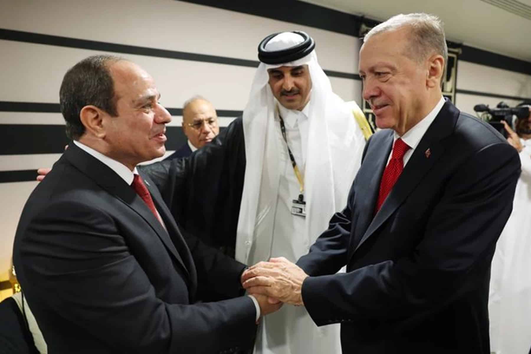 وطن- التقى الرئيس المصري عبد الفتاح السيسي، بحضور أمير قطر الشيخ تميم بن حمد آل ثاني، بالرئيس التركي رجب طيب أردوغان، على هامش افتتاح مونديال قطر 2022، وهو اللقاء الأول بين الزعيمين اللذينِ ساد الفتور علاقتهما منذ صعود السيسي للسلطة في مصر بانقلاب عسكري أدانه أردوغان.