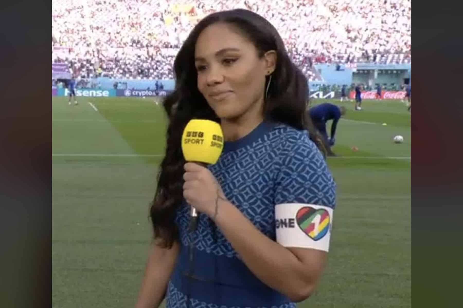 وتعمدت مذيعة قناة “بي بي سي”، ارتداء شعار المثلية “one love”، أثناء تغطيتها لمباراة منتخبي إيران وإنجلترا، اعتراضًا على منع قائد المنتخب الانجليزي، هاري كين، من ارتداء شارة المثلية، رغم الحظر الذي فرضته الفيفا، والذي انصاع له بالفعل سبع منتخبات.