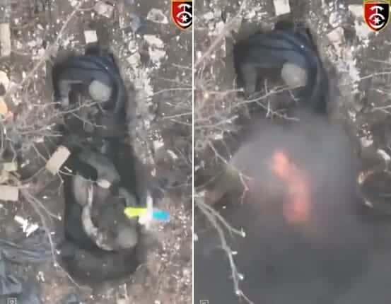 وأظهر الفيديو، قنبلةً ألقتها المسيرة على جنديين روسيين على الأقل، كانا متحصنين في إحدى الجبهات.