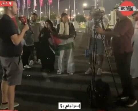 وخلال تغطيته المباشرة للمونديال من أمام استاد البيت، أحاط عدد من المشجعين العرب بالمراسل حاملين الأعلام الفلسطينية، وأخذوا يهتفون: “يلا يلا يلا.. إسرائيلي برا”.