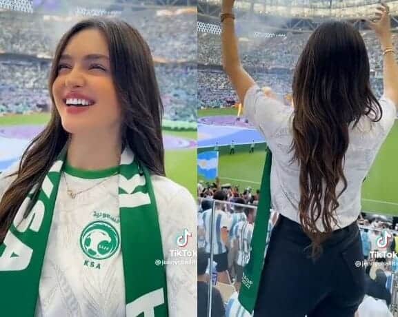 وظهرت “التيك توكر” جيني شليطا، وهي ترتدي تيشرت المنتخب السعودي في المدرجات، وتؤدي حركات راقصة على أغنية “للأهلي جينا”.