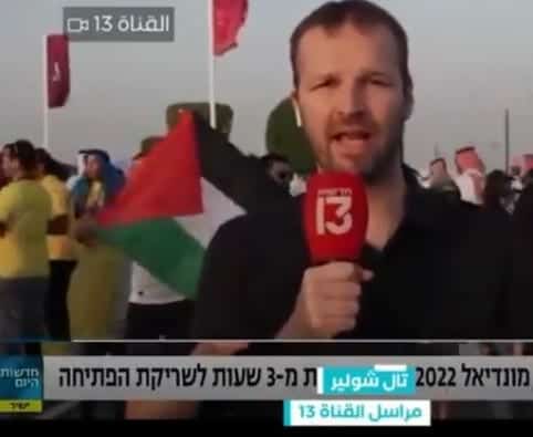 مراسل قناة 13 الإسرائيلية “تال شولير”، ظهر في مقطع فيديو وهو يقول: “هؤلاء يستغلون المنصة هنا في بطولة كأس العالم.. وأيضا يوجد هنا مؤيدون للفلسطينيين .. رأينا الكثير من أعلام فلسطين”.