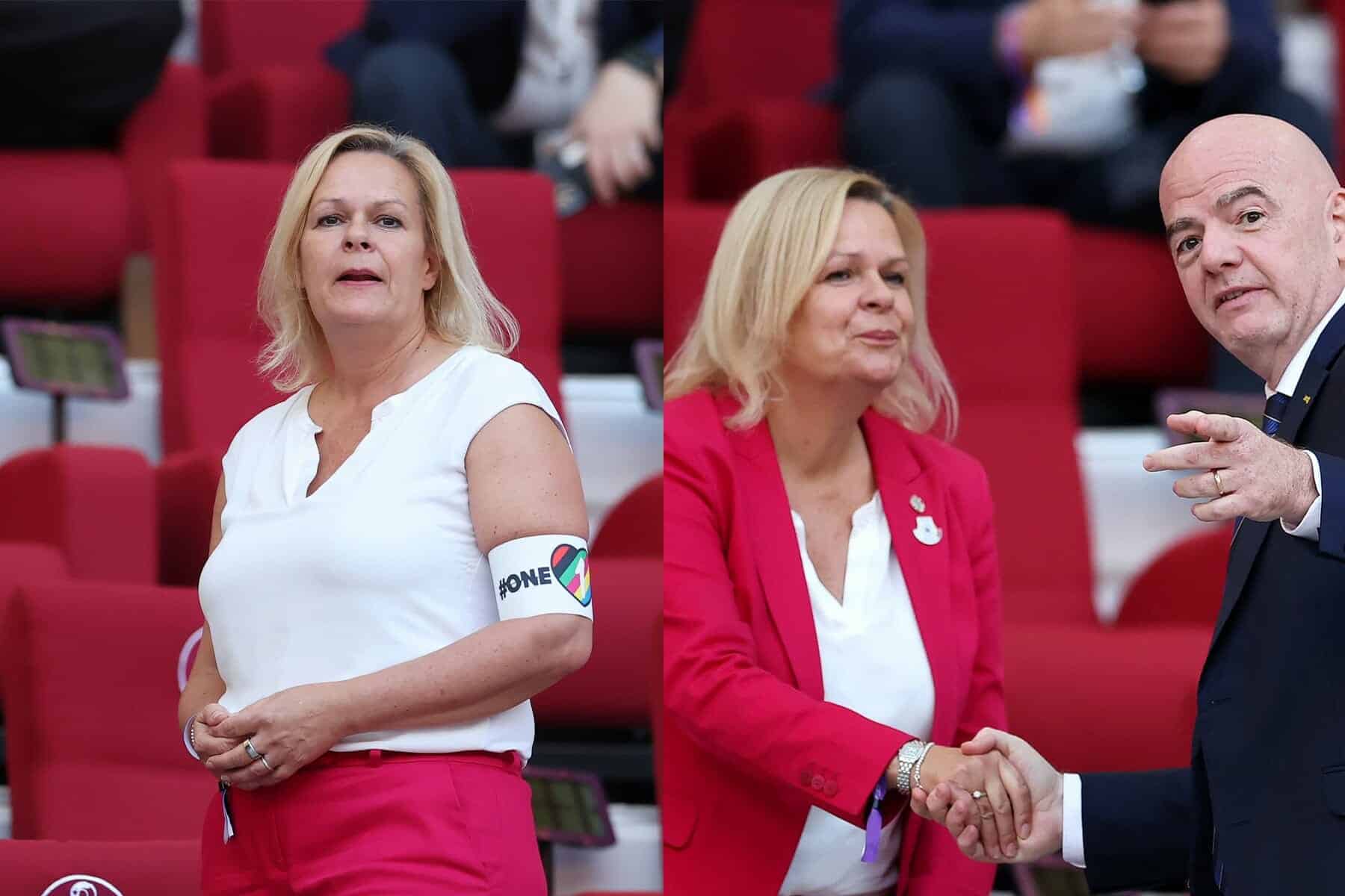 وفي تحدٍّ وقح لقوانين قطر البلد المضيفة لكأس العالم وقرارات الاتحاد الدولي لكرة القدم، شوهدت وزيرة الداخلية الألمانية وهي ترتدي شارة المثليين داخل ستاد خليفة الدولي.