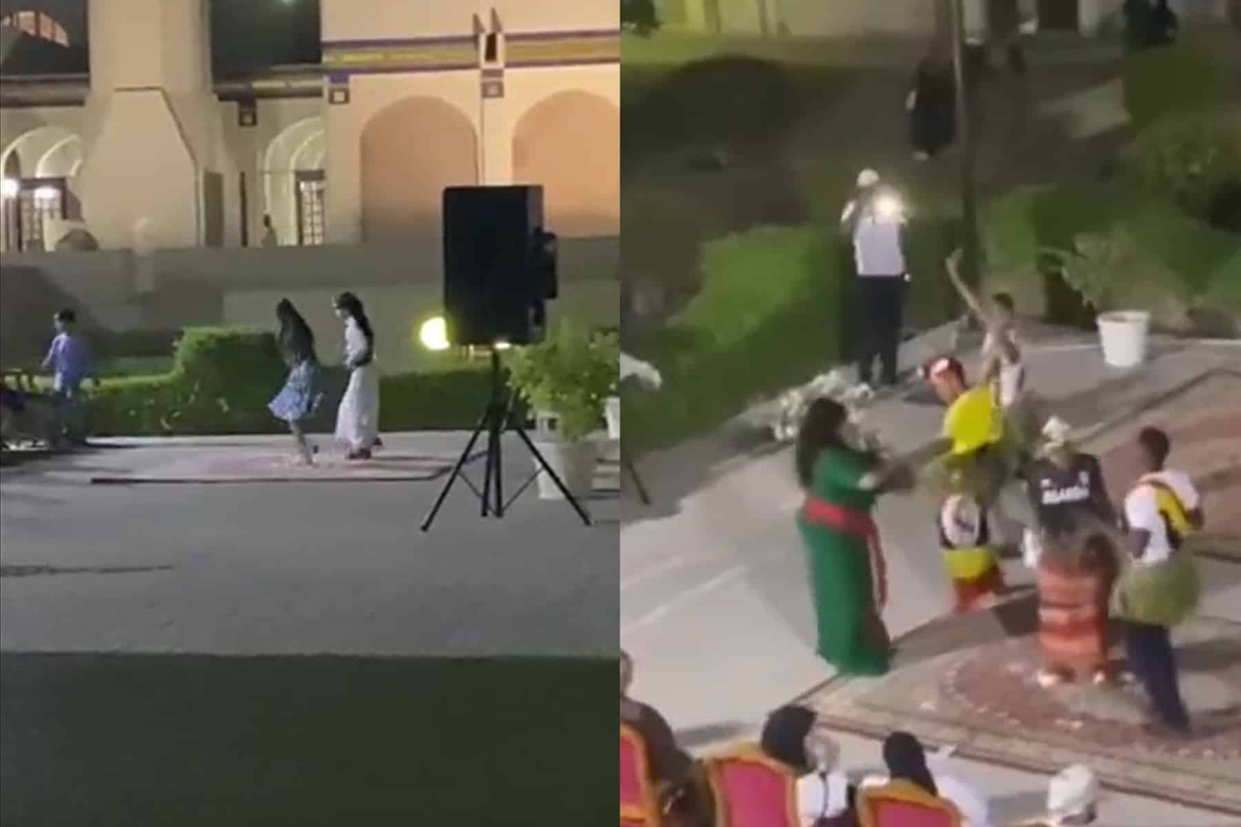 وبيّن مقطع فيديو آخر وصلةَ رقص مختلفة لفرقة إفريقية على ما يبدو، يتوسطها سيدة تتمايل على أنغام الموسيقى وترقص وهي ترتدي ملابس ضيقة أبرزت مفاتنها.