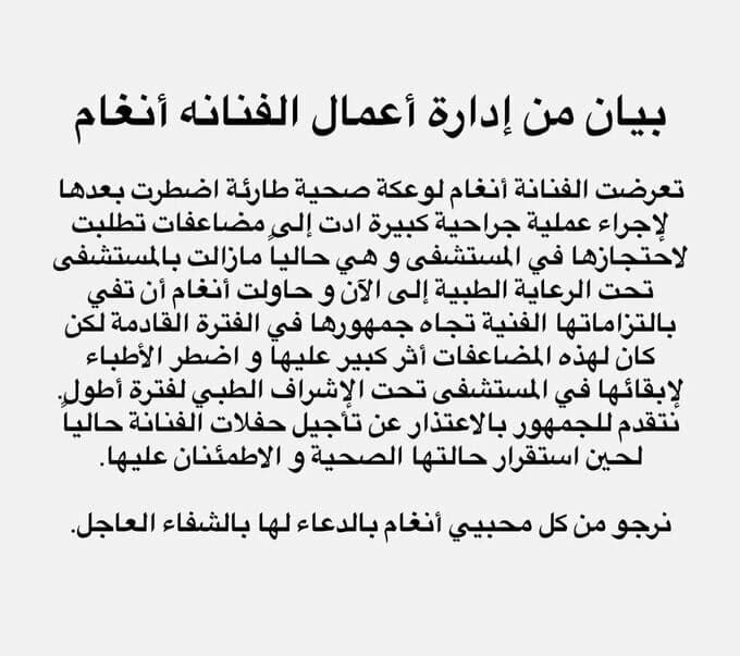 وجاء في البيان: “تعرضت الفنانة أنغام لوعكة صحية طارئة، اضطرت بعدها لإجراء عملية جراحية كبيرة. أدت إلى مضاعفات تطلبت احتجازها في المستشفى”.