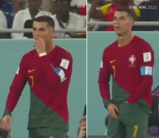 وأظهر الفيديو، رونالدو وهو يدخل يده في سرواله، وأخرجه شيئا وتناوله، دون أن يتضح في المقطع ما الذي مضعه الدون البرتغالي.
