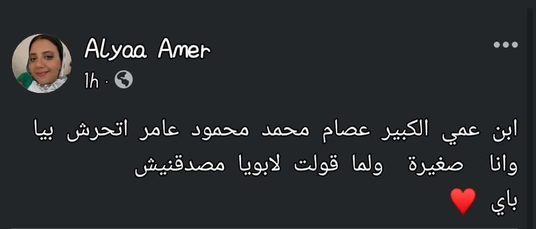 وكتبت علياء عامر (24 عاماً)، قبل وفاتها، عبر حسابها على “فيسبوك”: ” ابن عمي الكبير عصام محمد محمود عامر اتحرش بيا وأنا صغيرة، ولمّا قولت لأبويا مصدقنيش.. باي”.