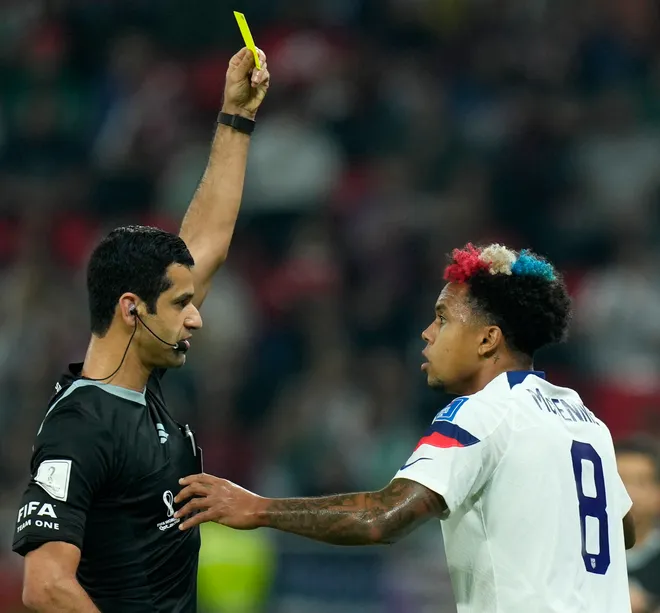 ردة فعل اللاعب الأميركي ويستون ماكيني عند تحصله على بطاقة صفراء خلال المباراة الافتتاحية لكأس العالم ضد ويلز