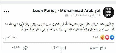 وكان محمد عربيات قد أعلن عقد قرانه في تاريخ 14 من الشهر الجاري، عبر صفحته الشخصية بموقع فيسبوك.