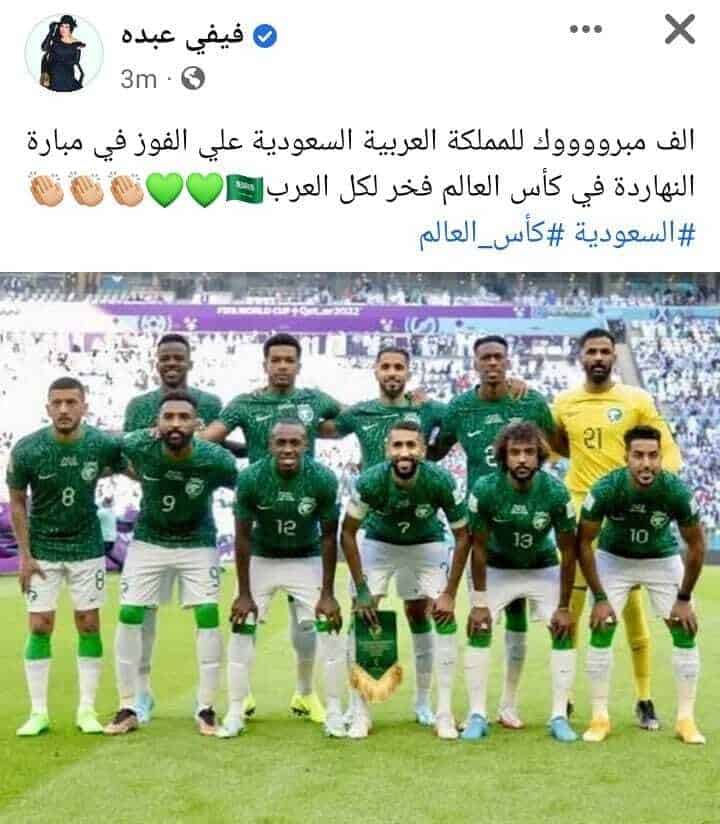 وكتبت فيفي عبده عبر حسابها الرسمي على “فيسبوك”: “ألف مبروك للمملكة العربية السعودية على الفوز في مبارة النهاردة في كأس العالم. فخر لكل العرب”.
