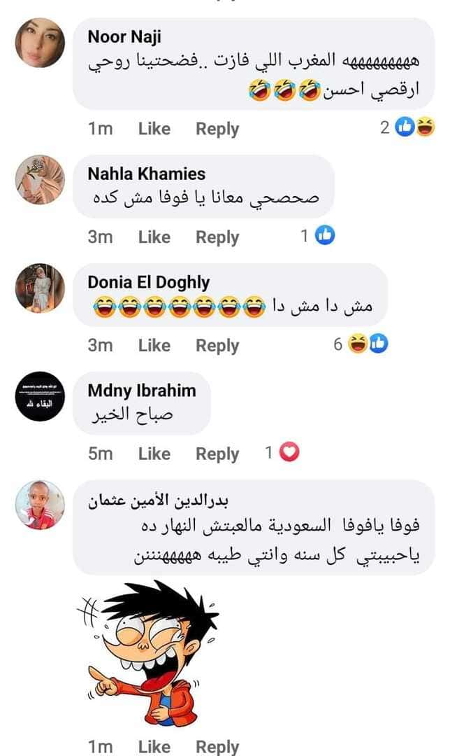 وكانت فيفي عبده قد وجّهت التهنئة للمنتخب السعودي بدلاً من المنتخب المغربي، الذي فاز في المباراة بهدفين دون رد على حساب نظيره البلجيكي.