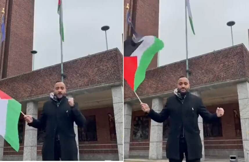 وطن – أظهر مقطع فيديو لحظة وُصفت بالتاريخية، عندما تم رفع علم فلسطين مدينة أوسلو بالنرويج.