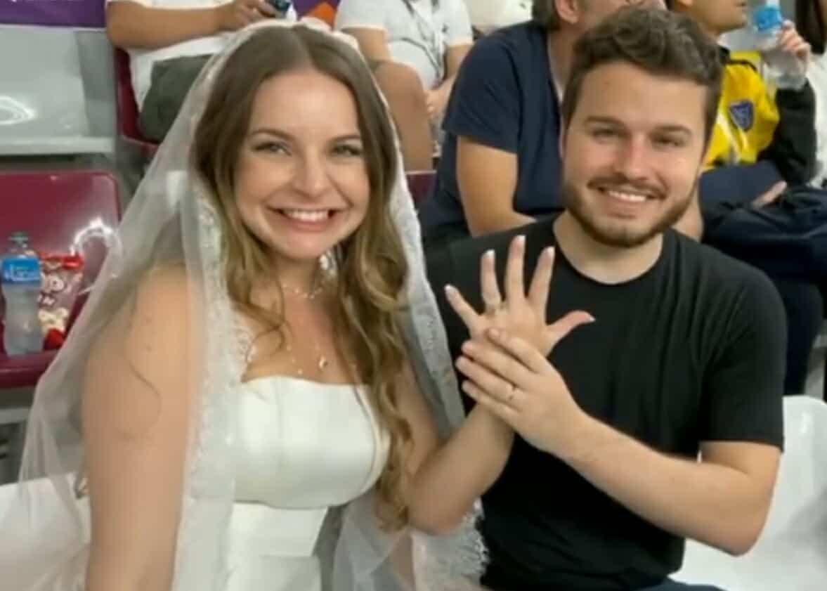 ويبدو أن عروسين قررا الاستمتاع بحفل زفافهما وحضور المباراة بين المنتخبين، حيث ظهرت العروس وهي ترتدي البدلة البيضاء، وتستعرض خاتم الزواج إلى جانب العريس.