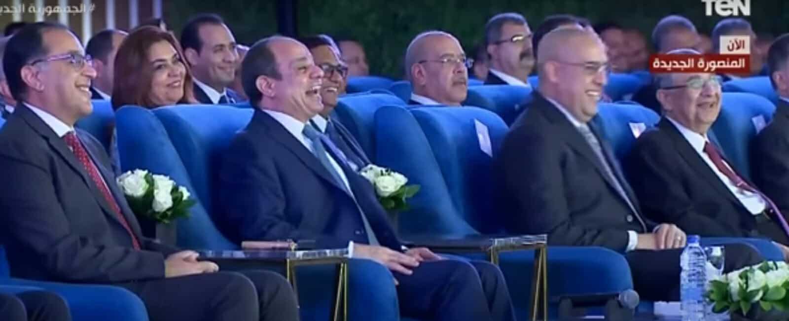 وبعدها وفي دعابة ذكر اسمه ضمن هؤلاء النجوم بالقول: “والفنان العظيم شريف منير”، وهو ما جعل السيسي ينفجر في الضحك.