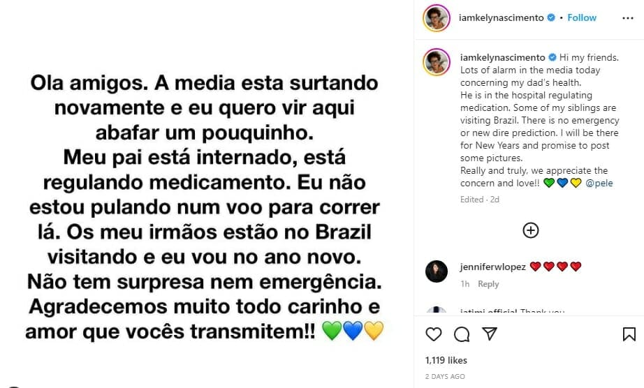 في وقتٍ لاحق من ذلك الأسبوع، طمأن بيليه المعجبين بأنّ زيارته كانت روتينية فقط، بصورةٍ نشرها على حسابه في انستغرام.