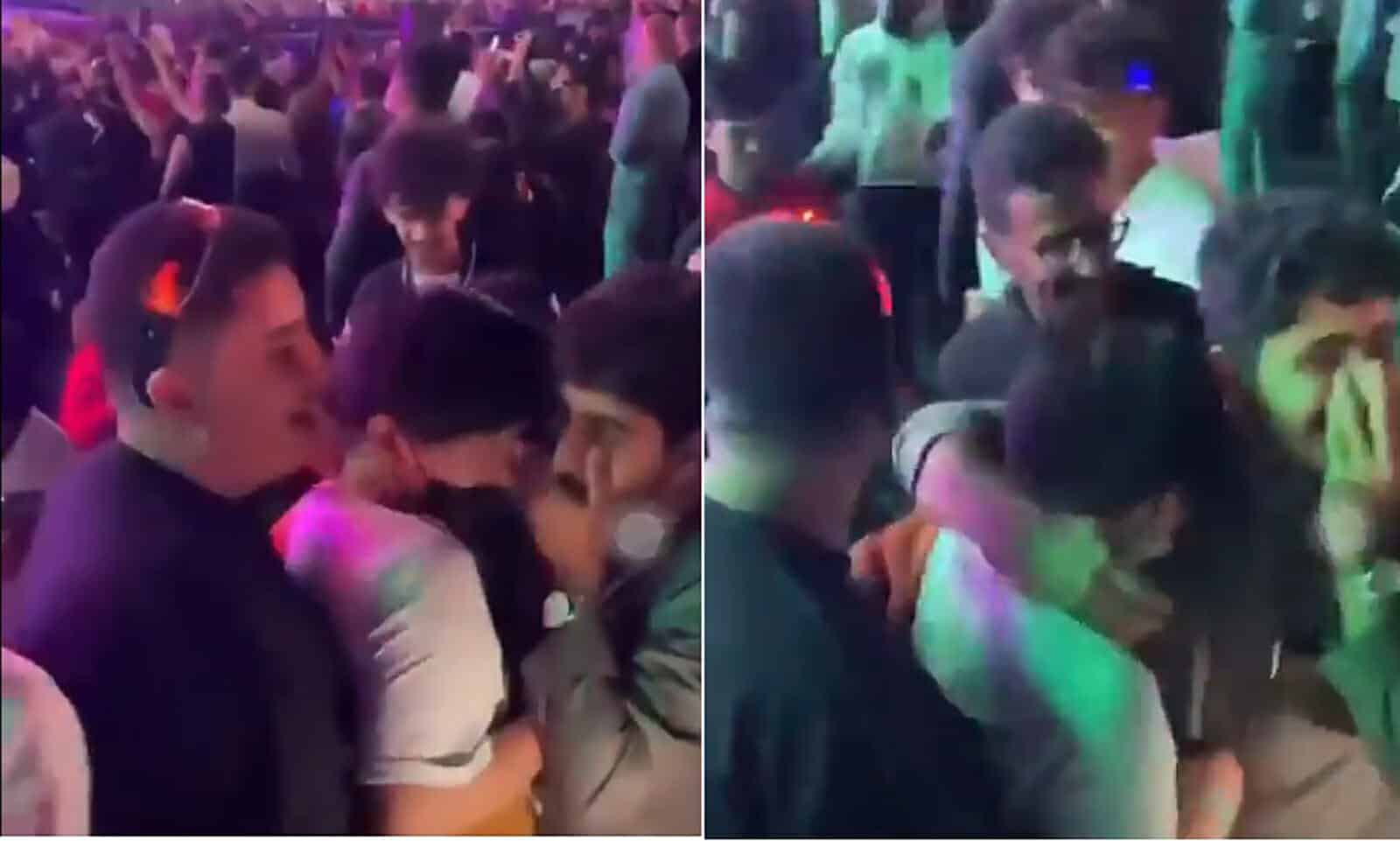 وأظهر المقطع الذي التُقط ليلاً أجواءً صاخبة وشخصين يضعان شخصاً ثالثاً في منتصفهما، ويتحسسانه في حركات جنسية فاضحة.