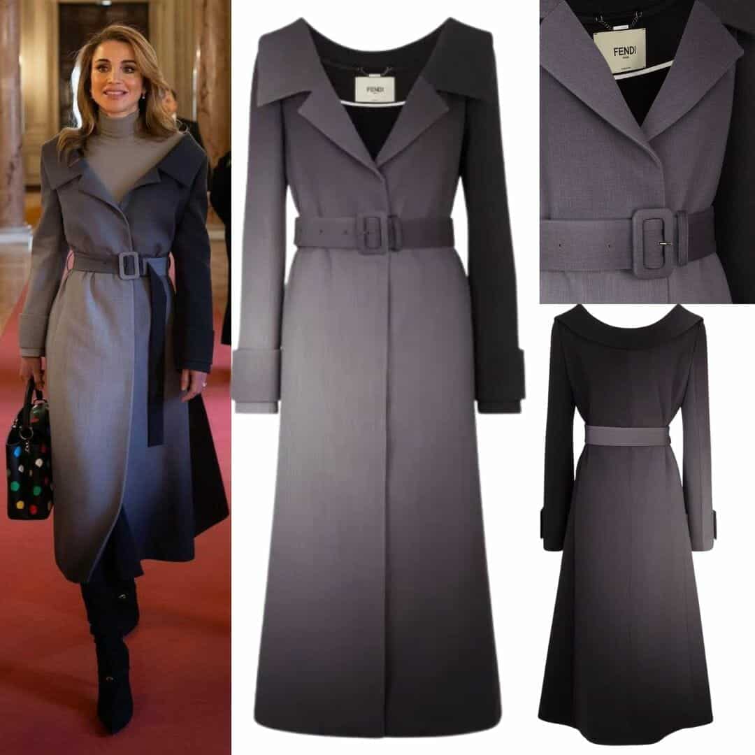 ارتدت الملكة رانيا لهذا اليوم معطفاً من قماش أومبريه من “فندي”، مع كنزة بياقة مدورة رمادية اللون من سالفاتور فيراغامو، وتنورة سوداء.