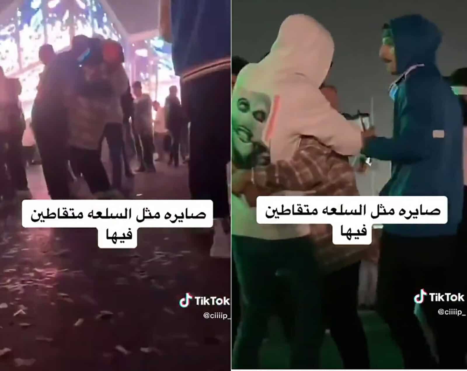 وأظهر مقطع التُقط ليلاً أجواءً صاخبة وشخصين يضعان شخصاً ثالثاً في منتصفهما، ويتحسسانه في حركات جنسية فاضحة.