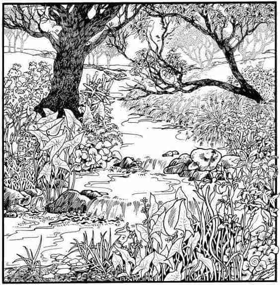 الصورة أعلاه، عبارة عن رسم تخطيطي بالأبيض والأسود لغابة.