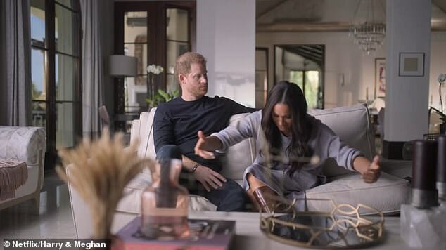 في برنامج “نتفليكس”، ابتسمت ميغان ابتسامة ساخرة وهي تُقلّد الملكة إليزابيث الثانية، وتحني رأسها على ركبتيها، وتفتح ذراعيها على نطاق واسع في تقليدٍ خَنوع وزائف.