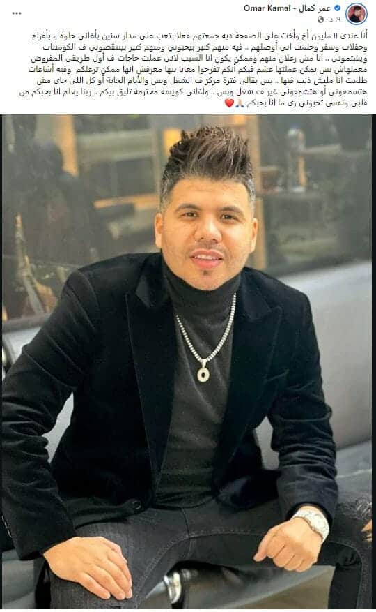 وكتب كمال عبر “فيسبوك”: “أنا عندي 11 مليون أخ وأخت على الصفحة دي، جمعتهم فعلا بتعب على مدار سنين بأغاني حلوة. وبأفراح وحفلات وسفر وحلمت إني أوصل لهم”.