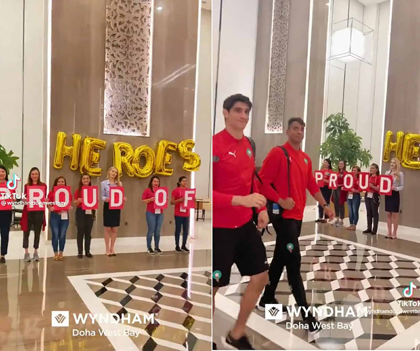 وظهر جميع المتواجدين في الفندق وجميع أعضاء البعثة المغربية، وهم يحيون لاعبي المنتخب المغربي والجهاز الفني، على إنجازهم الكبير والغير مسبوق.