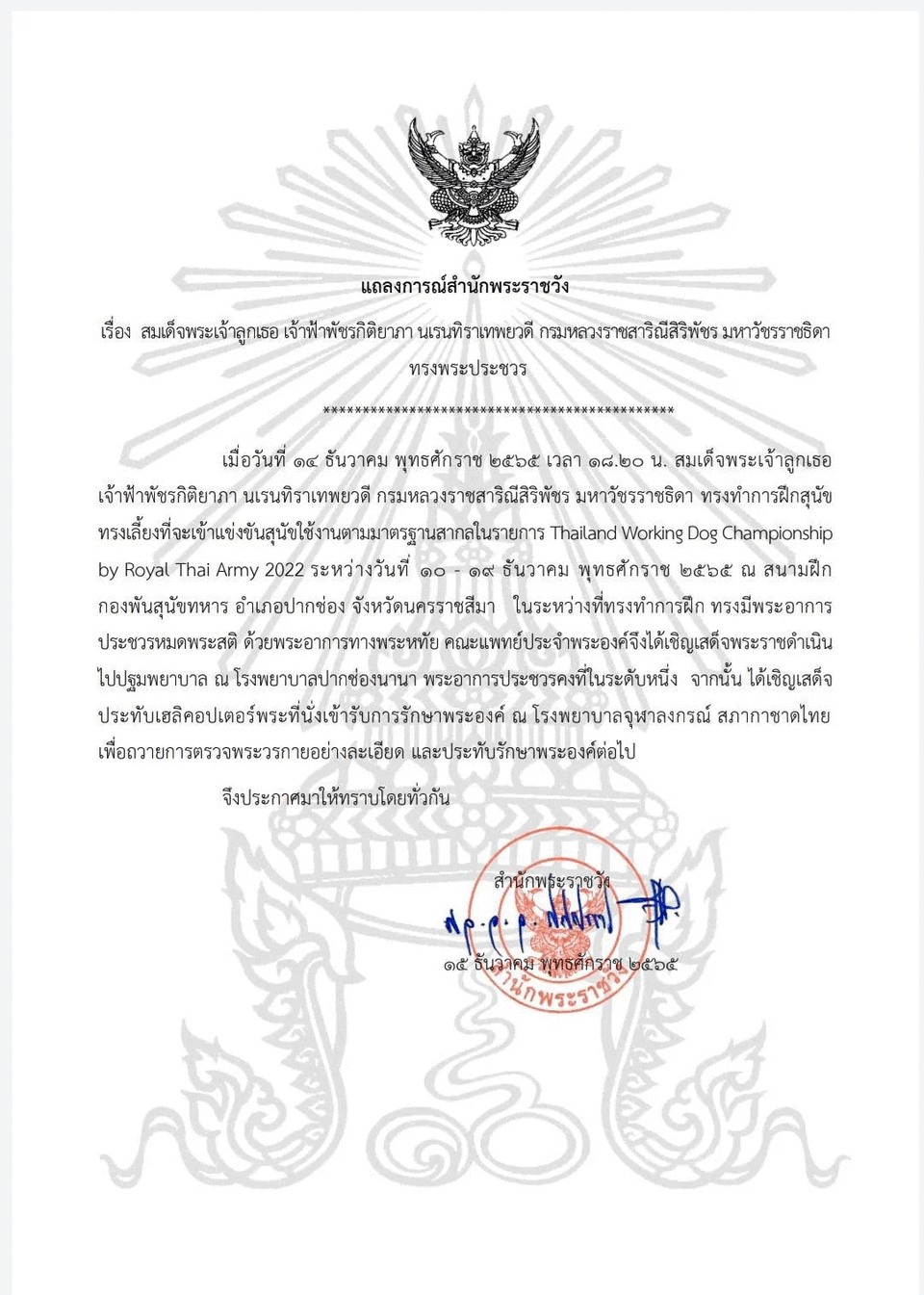 وبحسب ما ذكرت صحيفة “ديلي ستار dailystar“، فإن بيان القصر ذكر أن الأميرة باجراكيتيابا، الابنة الكبرى للملك فاجيرالونغكورن، انهارت أثناء تدريب كلابها شمال شرق بانكوك.