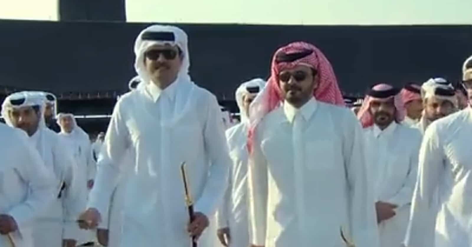 وبحسب مقطع متداول فقد بدا الشيخ تميم بن حمد، وهو يقف في وسط مجموعة من الأشخاص بينهم شقيقه ويلوح بسيف بيده اليمنى، فيما يمسك سيفاً آخر بيده اليسرى كما فعل الآخرون حوله.