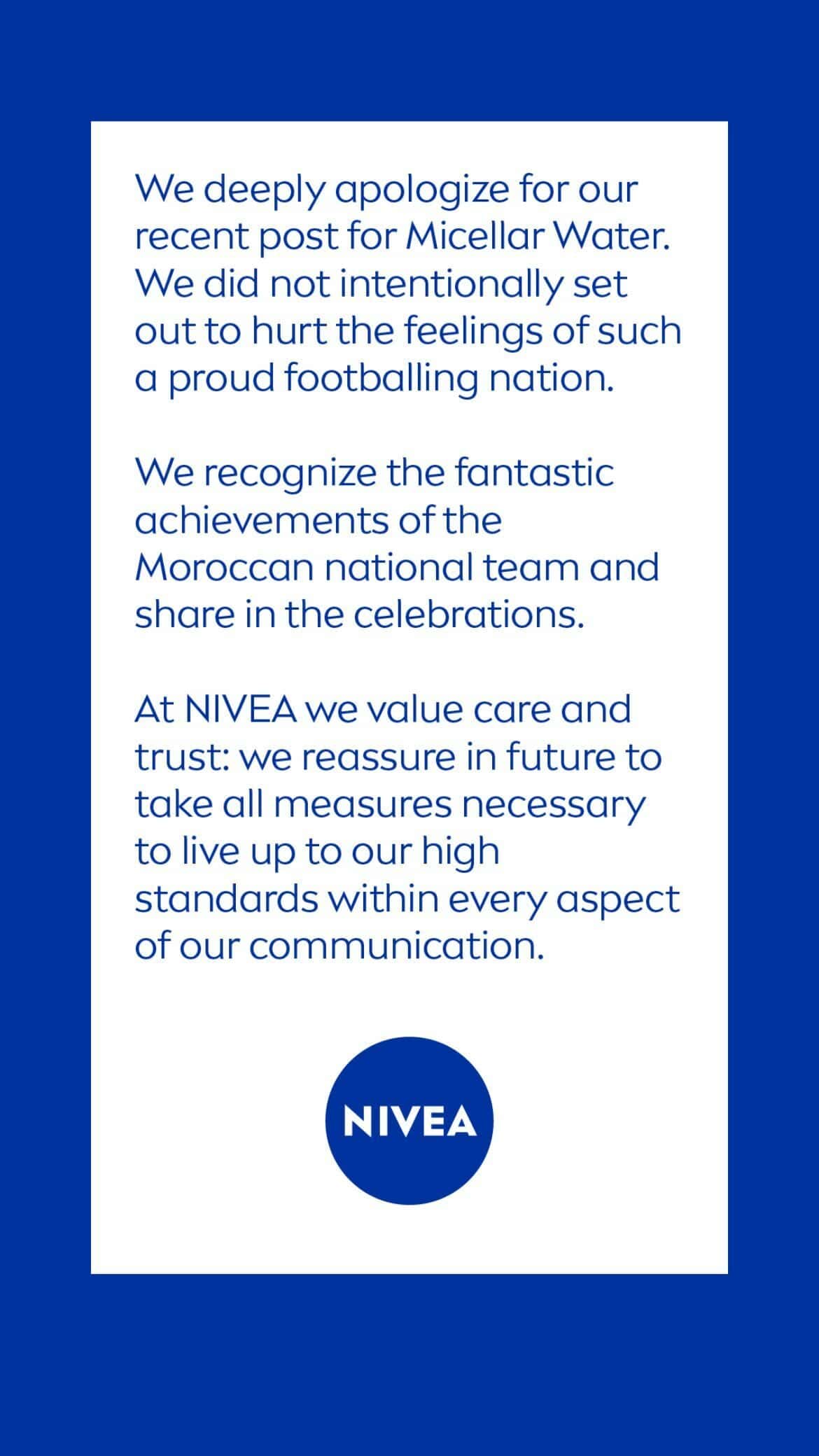 وجاء في اعتذار نيفيا الذي نشرته عبر خاصية “الستوري” في انستجرام: “نعتذر بعمق عن إعلاننا لمنتج ميكلر ووتر. لم نقصد أبداً جرح مشاعر جماهير كرة القدم الذين نفتخر بهم”.