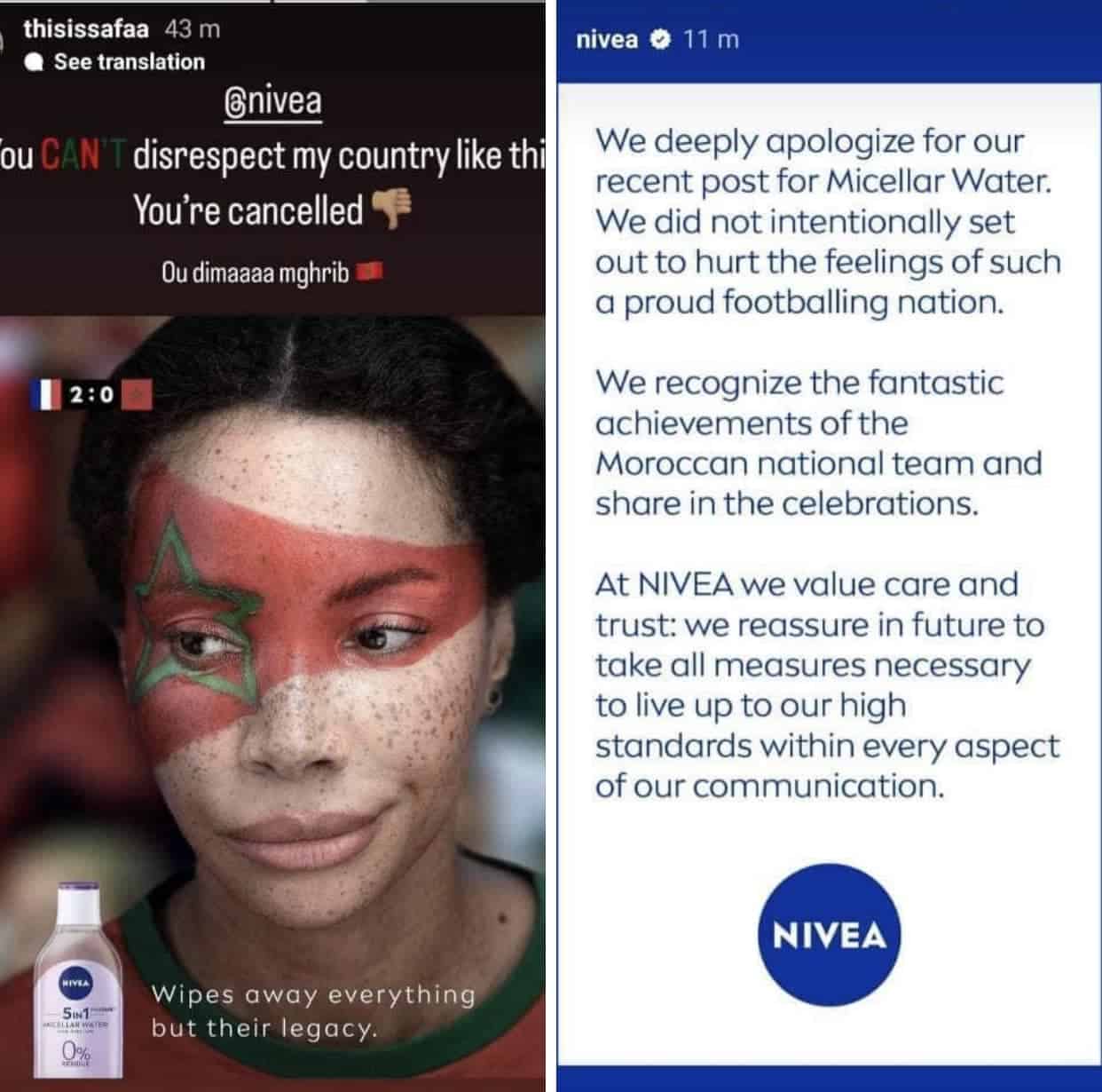 وجاء في التعليقات: ” تنشر Nivea هذا على انستجرام وتتوقع ألا ترى أو تتلقى أي رد فعل عنيف؟ النشر فقط عن كرواتيا والمغرب؟ لماذا لا تنشر عن ألمانيا؟ الأرجنتين؟ أو دول كبيرة أخرى؟ بمجرد أن يبدأ الأشخاص في مشاركة هذا والقول بأنه يجب إلغاءهم ، فإنهم يحذفون المنشورات”.