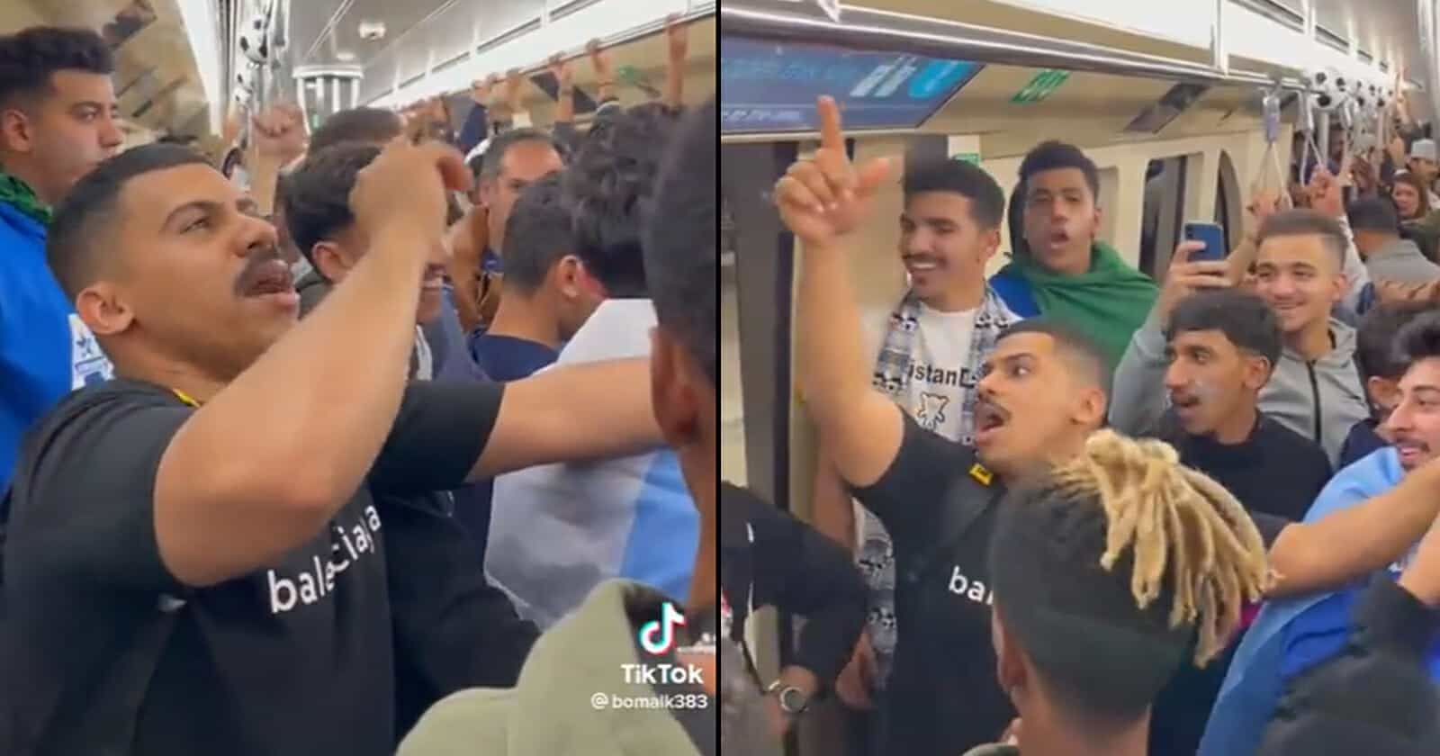 وظهر المشجع وهو يقف في “مترو الدوحة“، ويضع يده على فمه، ويردد بصوت عالٍ: “وداعاً يا قطر ودعناكي يا قطر بكل ارواحنا”، ويرد عليه المحيطون بعبارات حماس.