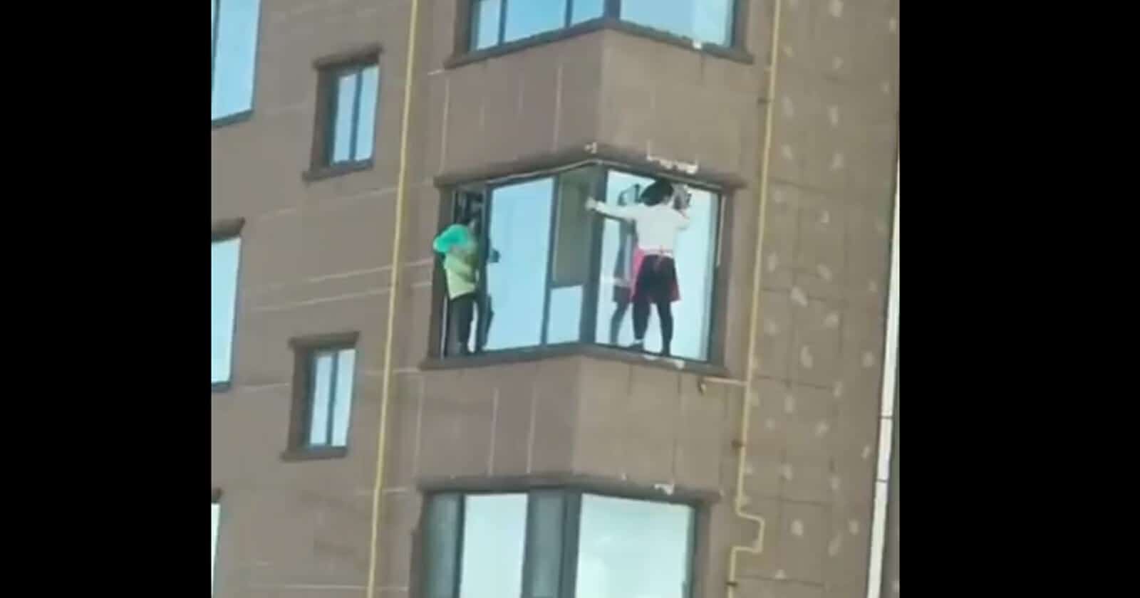 وأظهر الفيديو، العاملتان وهما يقفان على نافذة من الخارج، في مبنى ذي ارتفاع شاهق جدا، وينظفان الزجاج.