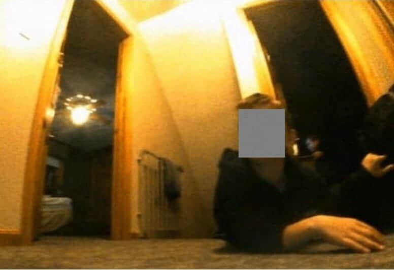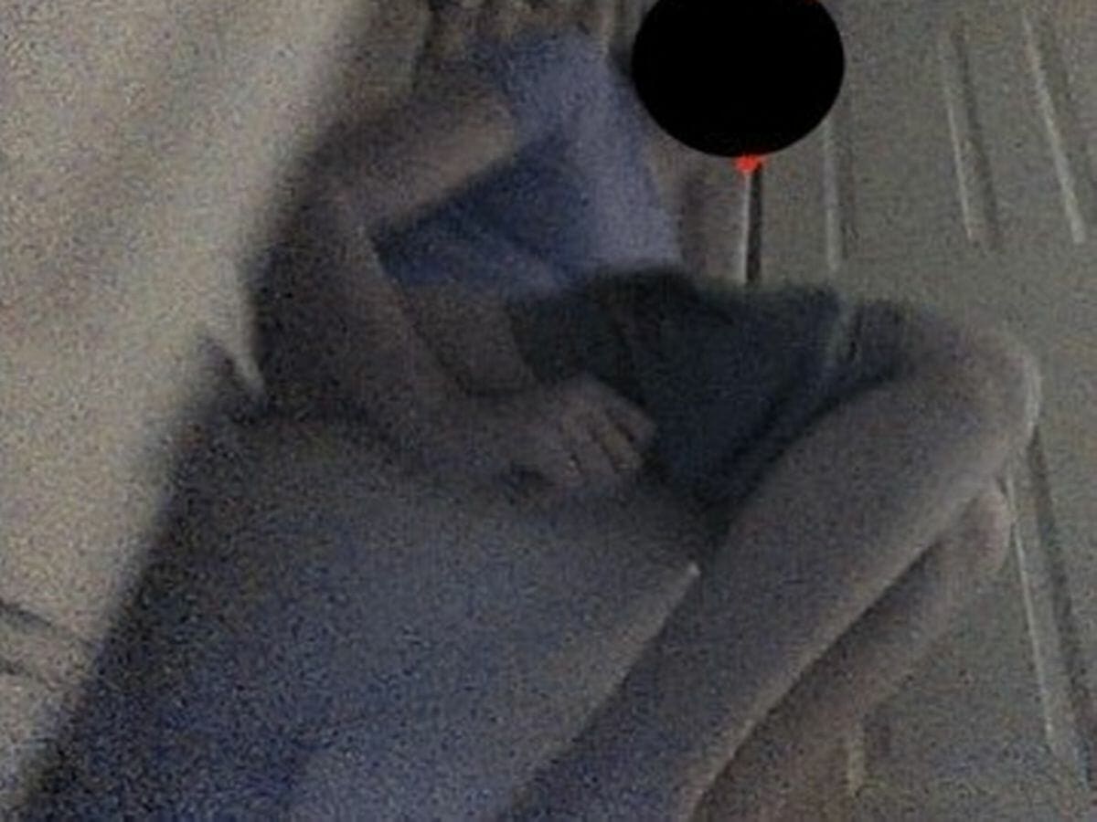 في إحدى الصور، تجلس امرأة شابة ترتدي قميصًا خزاميًا على المرحاض ، وسروالها القصير مشدود إلى منتصف الفخذ. وجه المرأة محجوب في الصورة الرئيسية ولكنه غير محجوب في لفافة اللقطات الموجودة أسفلها.