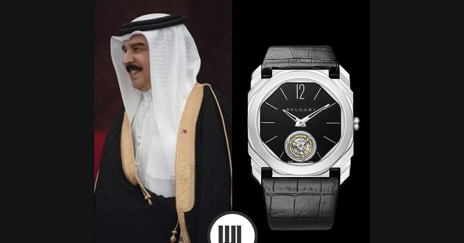 ونسب “الجمري” معلومات لموقع كويتي أشار إلى أنّ الملك حمد بن عيسى بن سلمان آل خليفة، يرتدي ساعة “بولغاري أوكتو فينيسيمو توربيون بلاتينيوم”.