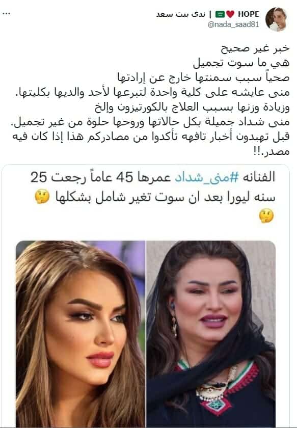 وتساءلت مغردة: “معقوله الصور الاخيره المنسوبه لمنى شداد حقيقه!؟ نتيجة تغيير وتجميل والا فوتوشوب!؟. حلو التغيير اللي يجمل ويصغر نفس ماسوت أصاله تغيرت بالتدريج ما صدمتنا مره وحده بشكلها الثاني الجديد”.