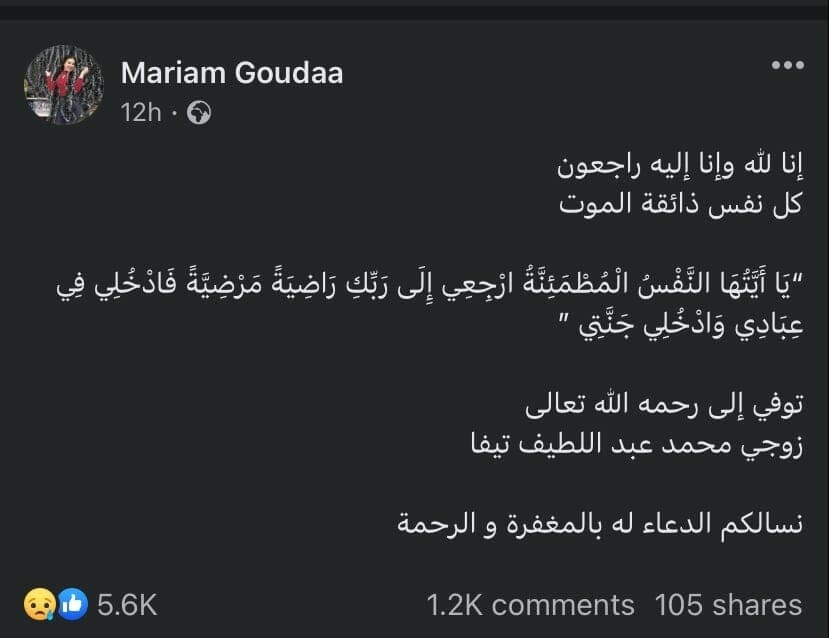 بعد ساعات فقط، أعلنت مريم جودة وفاة زوجها قائلة: “إنا لله وإنا إليه راجعون.. كل نفس ذائقة الموت، يا أيتها النفس المطمئنة ارجعي الى ربك راضية مرضية فادخلي في عبادي وادخلي جنتي.. توفي إلى رحمة الله تعالى زوجي محمد عبد اللطيف.. نسألكم الدعاء والمغفرة”.