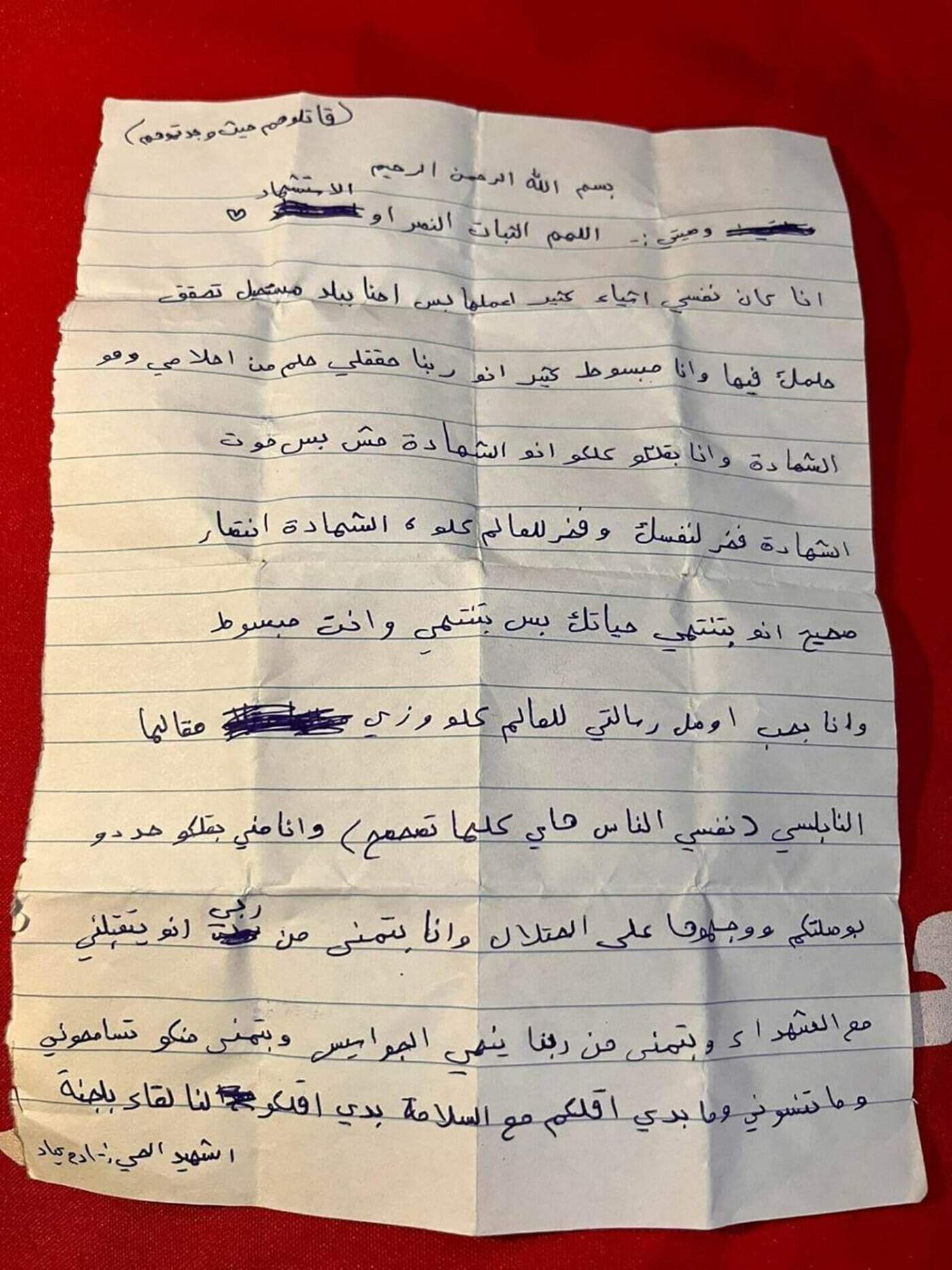 وطن– تداول نشطاء فلسطينيون، صورةً تُظهر وصيةً كتبها الفتى “آدم عياد”، الذي استُشهد برصاص قوات الاحتلال الإسرائيلي في مخيم الدهيشة، فجر اليوم الثلاثاء.