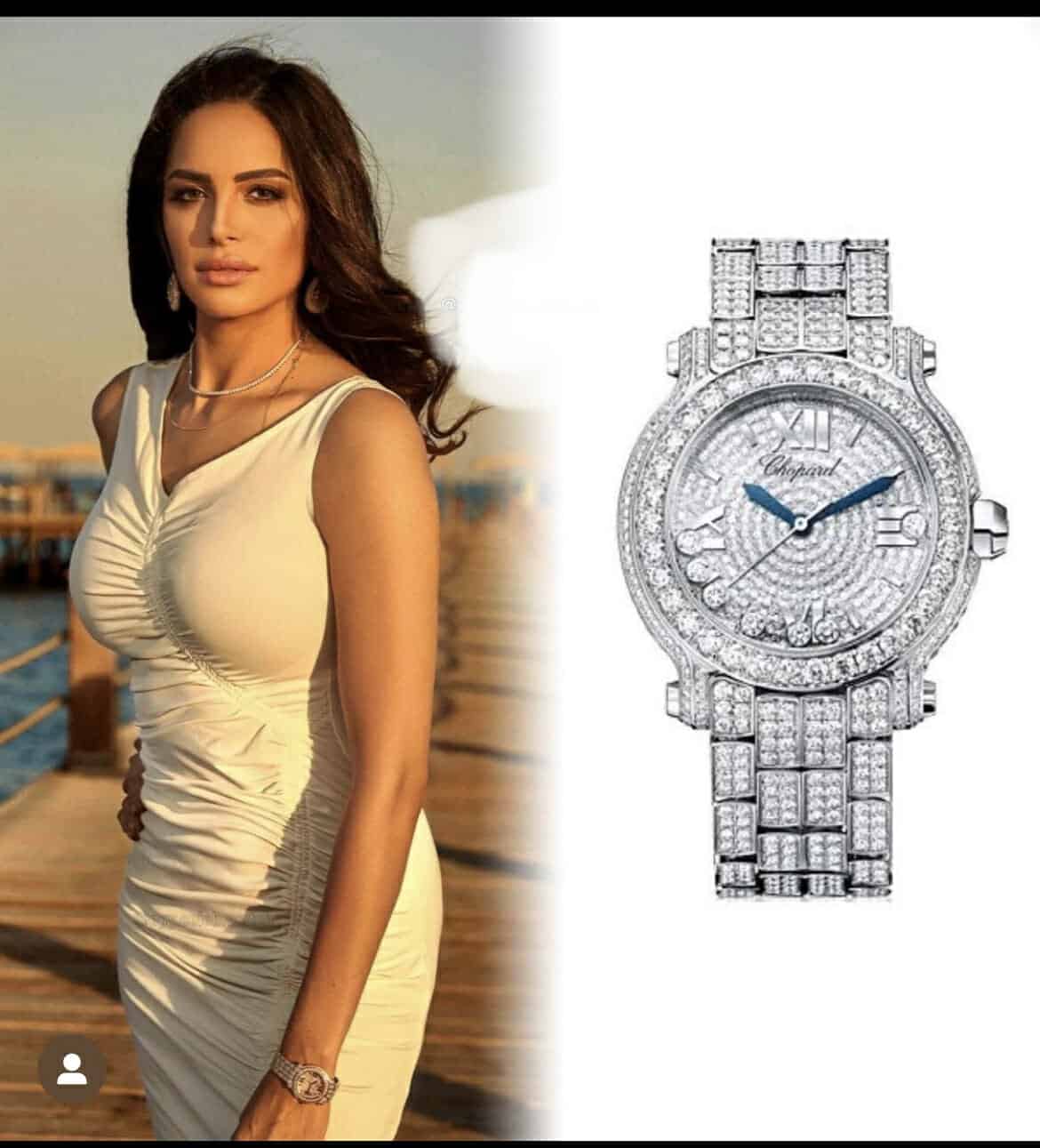 ولفتت الأنظار في حينها بإطلالة بفستان أبيض على البحر، مع ساعة يد من ماركة شوبارد العالمية.