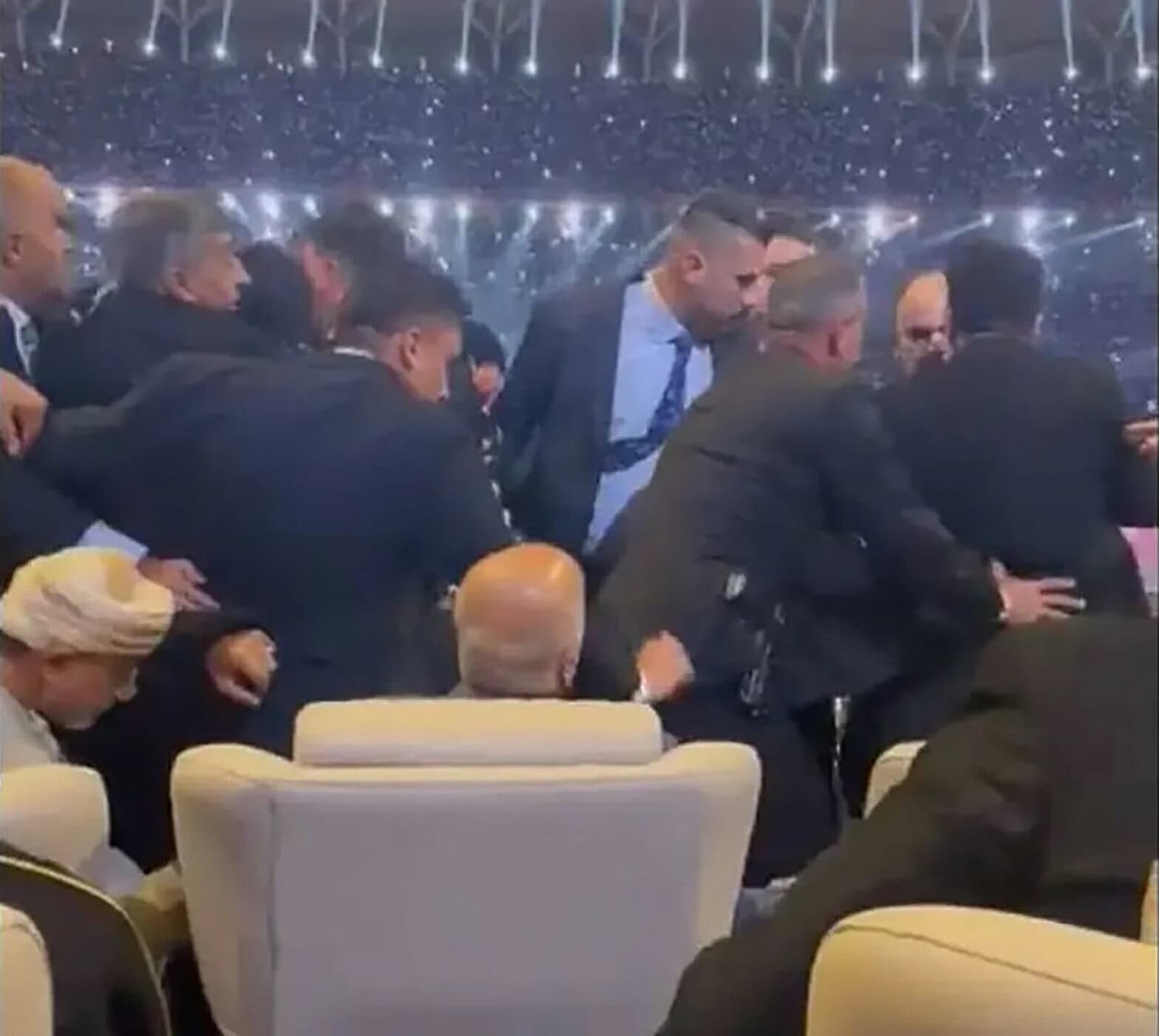 جاء ذلك بسبب تكدّس الجماهير حول البوابة، وجلس بانتظار صعوده إلى منصة كبار الشخصيات، لكنه لم يتمكن من ذلك بسبب تجمّع بعض الجماهير في السلم الكهربائي المؤدي إلى الطابق الثاني، وحصول انفلات أمني وتدافع.
