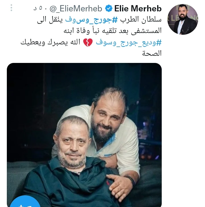 وكتب إيلي عبر حسابه في “تويتر”: “سلطان الطرب جورج وسوف يُنقل إلى المستشفى بعد تلقيه نبأ وفاة ابنه وديع.. الله يصبرك ويعطيك الصحة”.