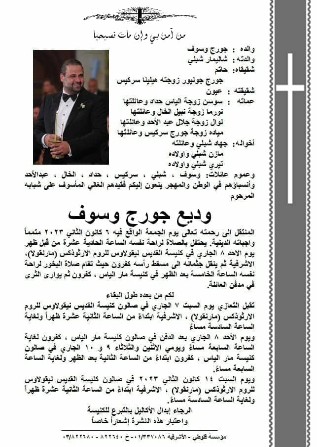 وتتقبل اليوم السبت أسرة سلطان الطرب جورج وسوف واجب العزاء في وديع نجل وسوف الأكبر. وذلك في صالون كنيسة القديس نيقولاوس للروم الأرثوذكس (مارنقولا)؛ “الأشرفية”، من الظهر وحتى السادسة مساء.