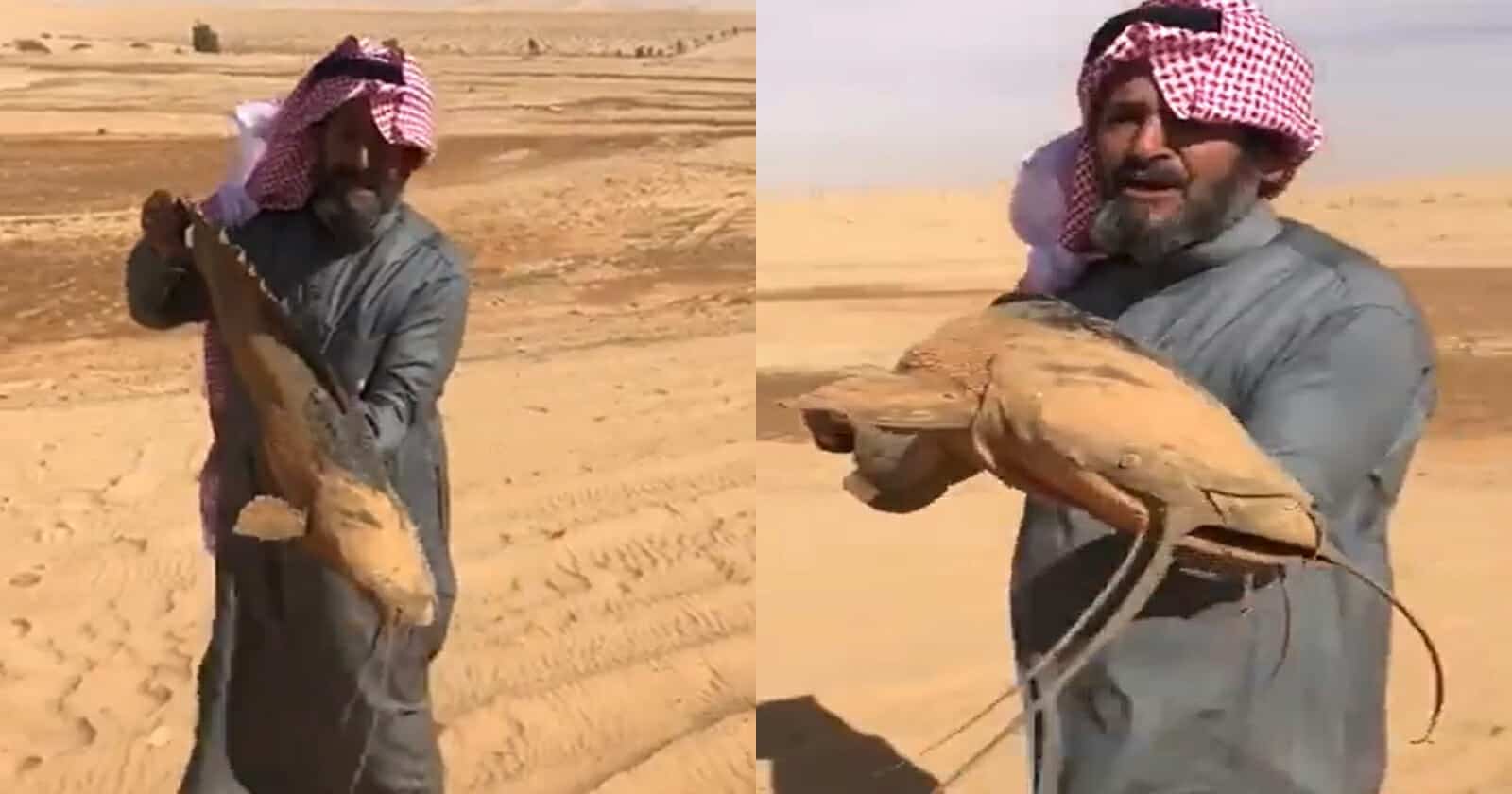 وخلال الأيام الماضية، انتشر فيديو على نطاق واسع لمواطن سعودي يقف في وسط الصحراء السعودية، ويمسك بسمكة من نوع “القرموط أو السلور”، ويتحدث عن أنه وجدها في وادي الرمة النهري الجاف في بريدة.